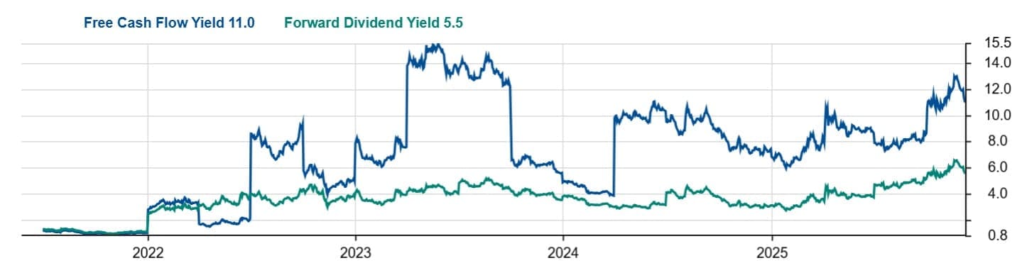ファンダメンタルズと無関係に株価が下がり、フリーキャッシュフロー利回りは11%(P/FCFはたった9.1倍)、配当利回りは5.5%あります。