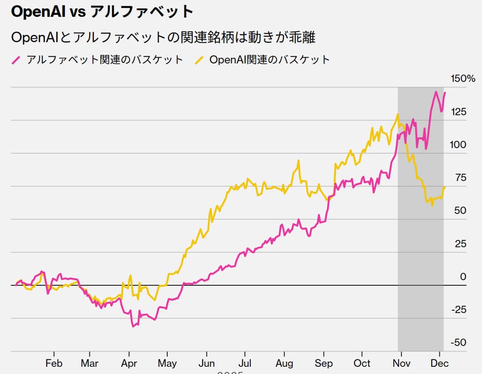 こうした動きがあった中、11月以降、投資家行動が変化しました。エヌビディアやオープンAI周辺銘柄を売り、グーグル周辺銘柄を買う動きが起こったのです。