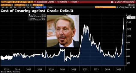 オラクルは声明でブルー・アウル離脱を確認した。この事実だけでオラクルの株価は再び急落し、同社のデフォルト(債務不履行)に備えるクレジット・デフォルト・スワップ(CDS)は、終値ベースで2009年以来の高値に近づいた。