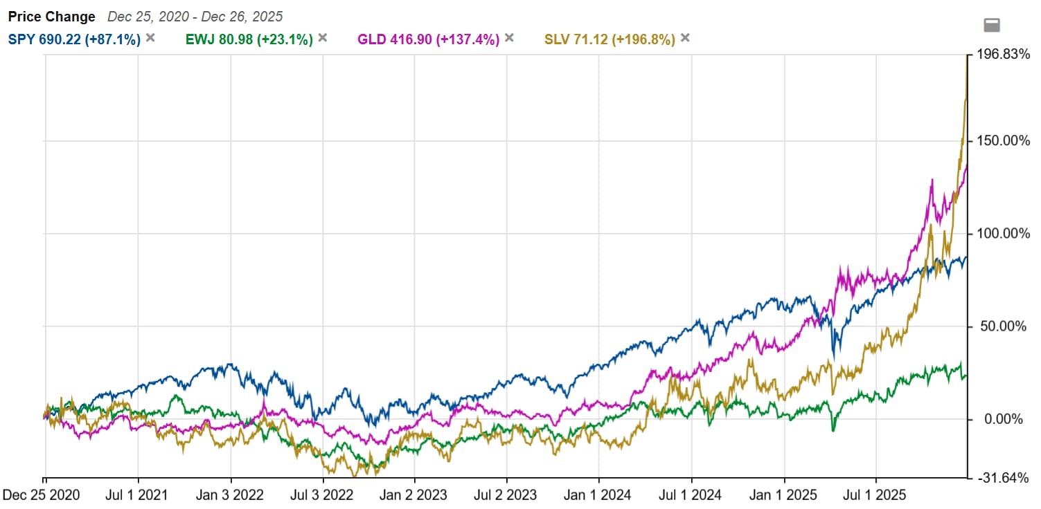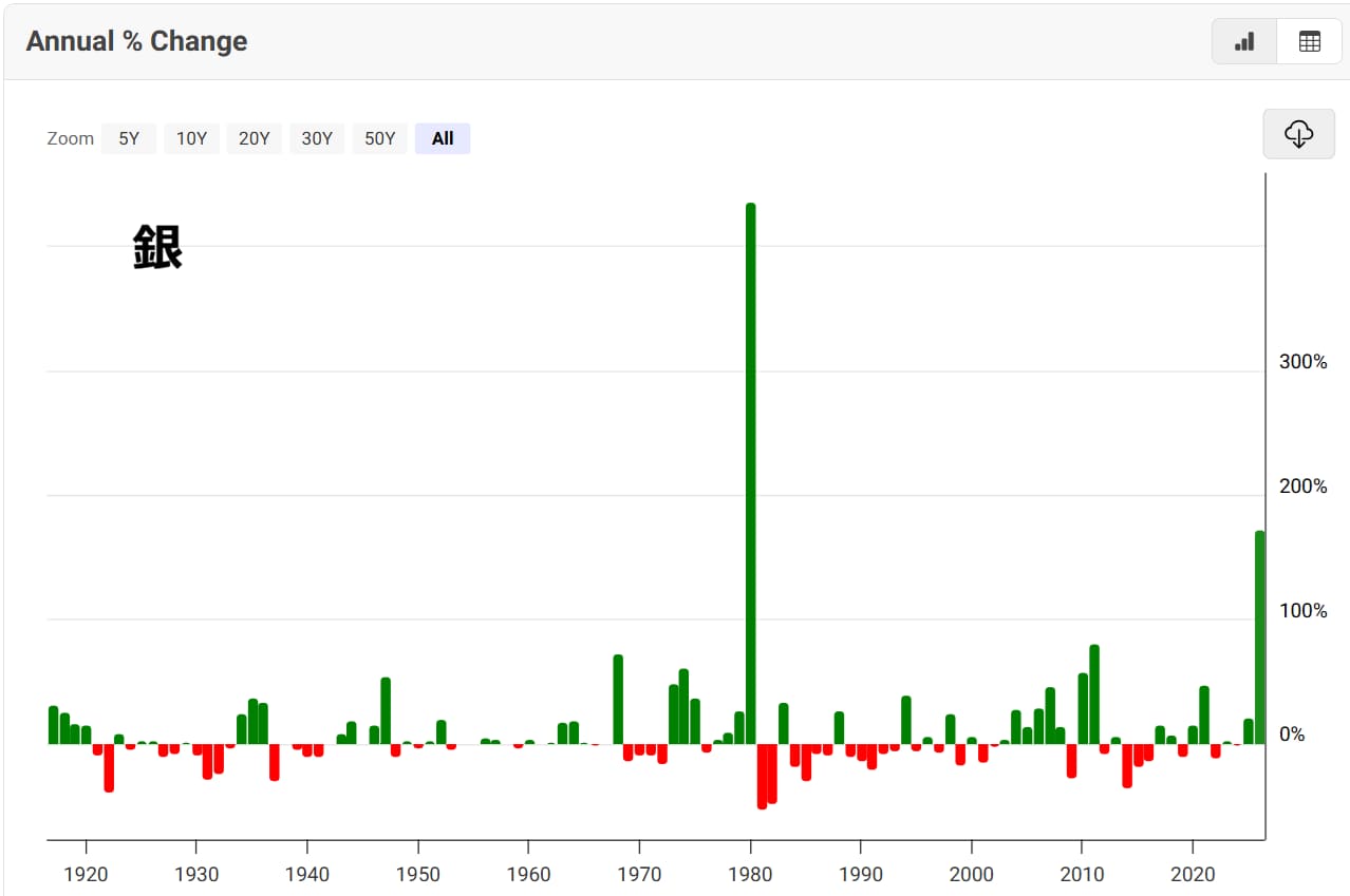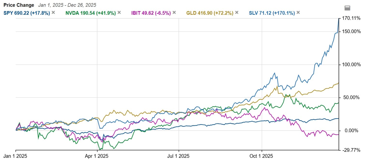 金・銀にとって今年は最高の年でした。金価格は72%、銀価格は170%上昇し、米国株やエヌビディアを遥かに上回るリターンを叩き出しました。