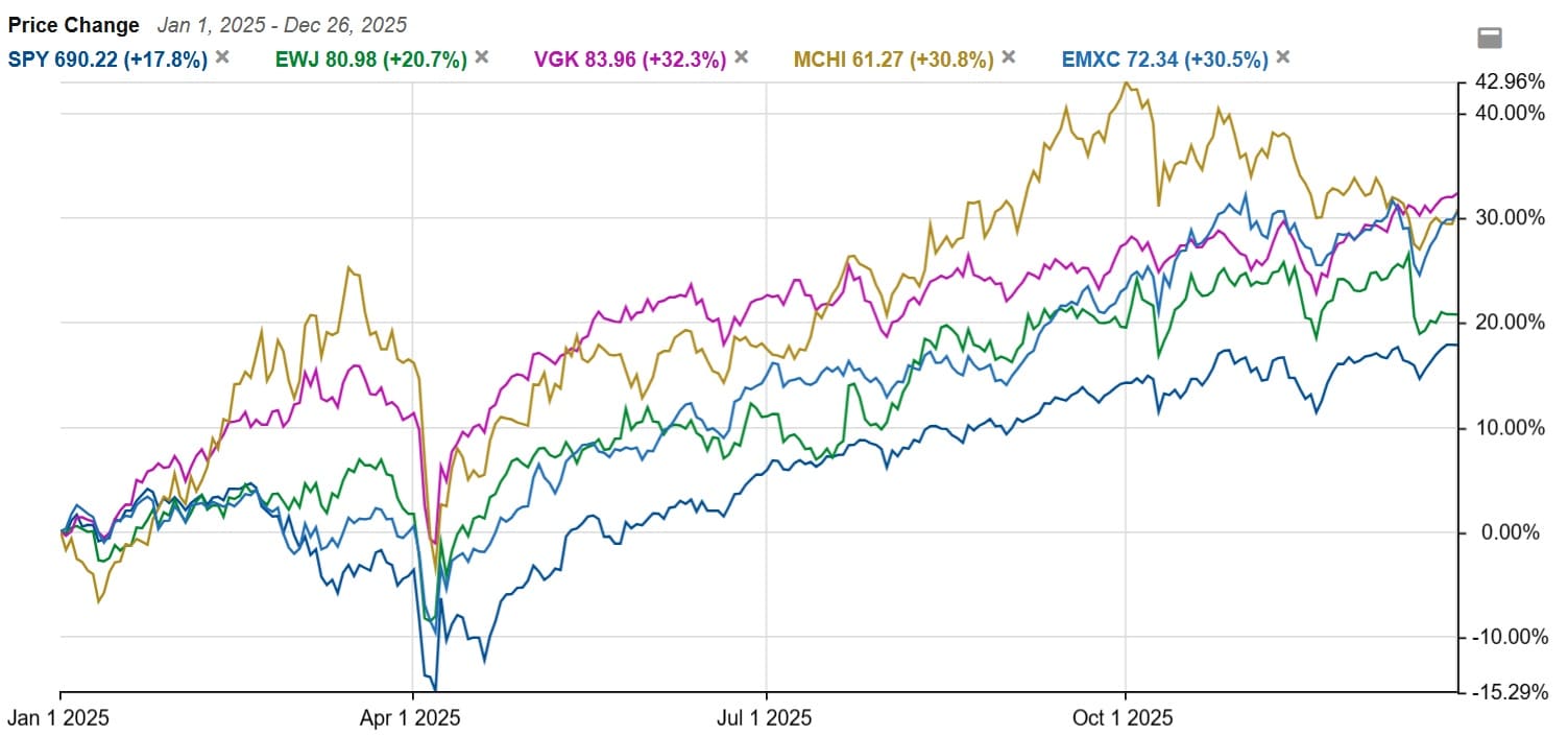 今年の株式市場は世界的に絶好調でした。4月に相互関税ショックが起こりましたが、その後反発し、振り返ってみれば米国、日本、欧州、中国、新興国の株式のドル建てリターンはどれも揃って好調でした。