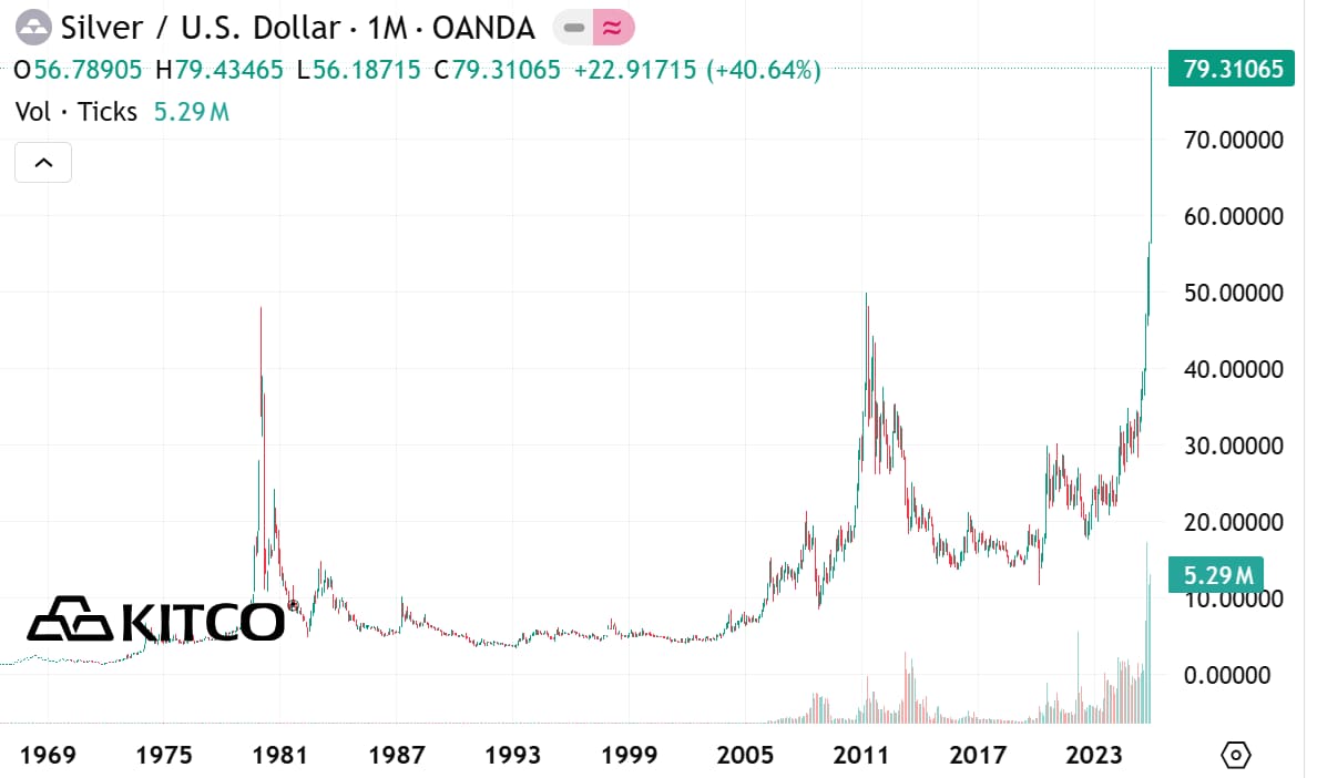 特に銀価格は物凄い値上がりで、1980年に付けた当時の最高値である1オンス50ドル弱を25年ぶりに更新しました。