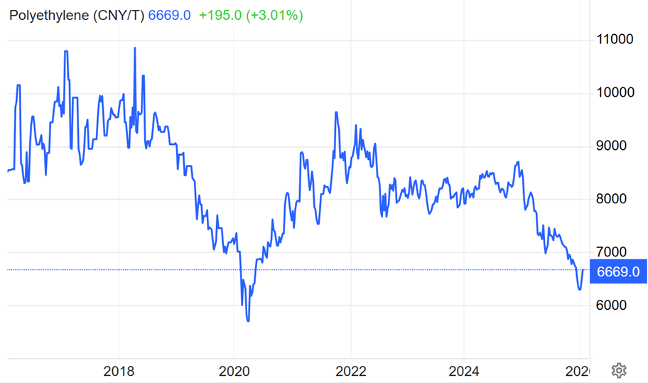 ところが今年に入り、マドゥロ大統領が拘束・拉致され、イランの反体制デモが激化し、米国が反体制派を間接的に支援する中で、ポリエチレン価格は反転上昇しています。