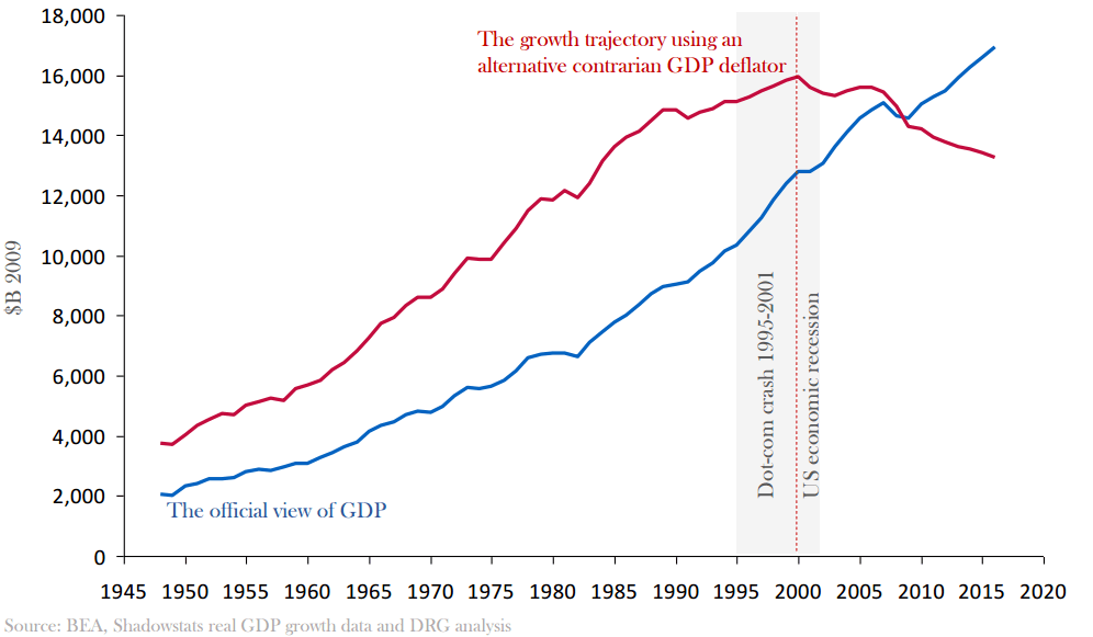 こうした生活者目線のインフレ率を利用して米国の実質GDPを計算すると、2000年をピークに現在に至るまで減少基調にあるというのです。つまり国民目線で見れば21世紀に入ってから米国の実質GDP成長率はマイナス化しているのです。