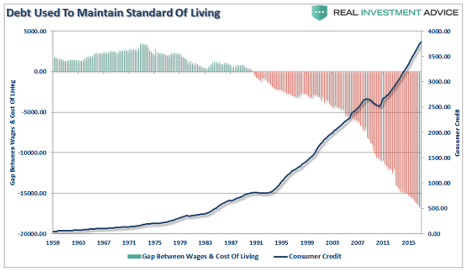 同じころ、米国民の賃金が出費に指数関数的に不足していき、消費者ローンも急増していきました。