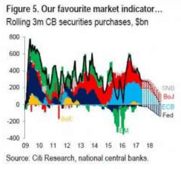 下図は中央銀行による資産購入額の3ヶ月平均での推移です。今後は減少に転じ、2018年末にはトータルでゼロ近辺にまで落ち込むと見られています。