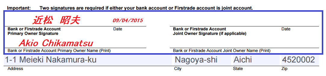 | Bank or Firstrade Account Joint Owner Signature | 共同名義人の署名。銀行口座、Firstradeの口座のどちらか一方が共同名義であれば必ず記入する。共同名義人が二つの口座で異なる場合はどちらか片方を記入すれば良い。 |