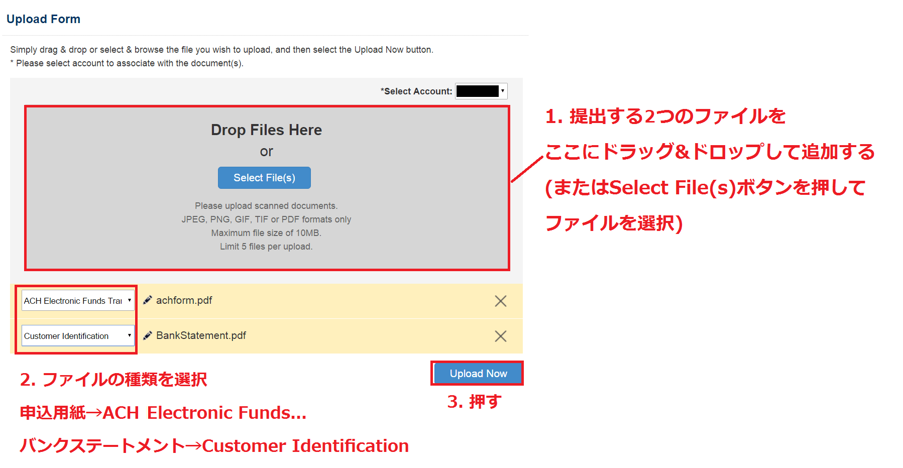 もしバンクステートメントがない、という場合にはご登録されている銀行に連絡してバンクステートメントをもらってください。2種類の書類を用意したらこれらをFirstradeに提出します。