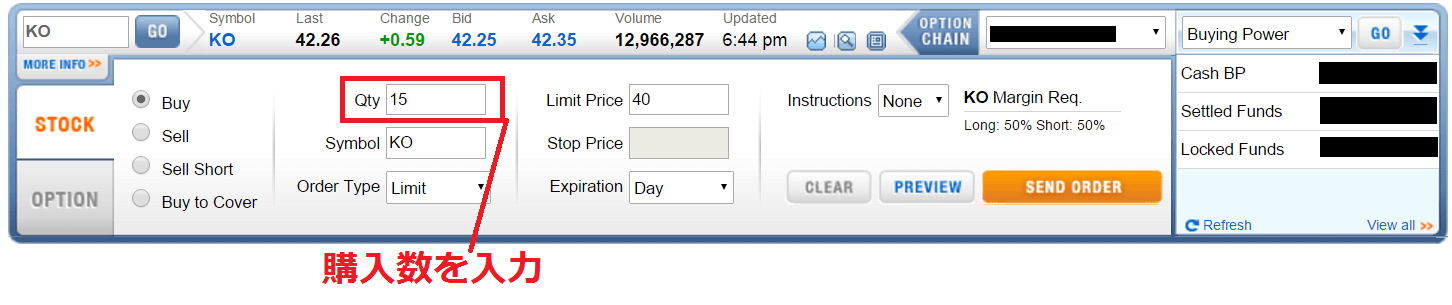 続いて「Qty」に購入銘柄数を入力します。 もちろん半角数字で入力してください。 ちなみにQtyは「Quantity」の略です。