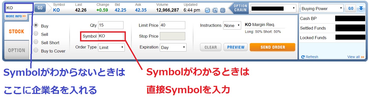 例えば下図は「いまはコカ・コーラの価格が42ドルを超えているけれども、40ドル以下で買いたい」ときを示しています。 Order Typeを「Limit」にして、Limit Priceを「40」と入力することで願いが反映されています。