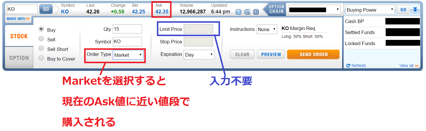 - Market:現在の市場価格ですぐさま購入したいとき。アメリカ市場がオープンしているときに利用するのが安定。
