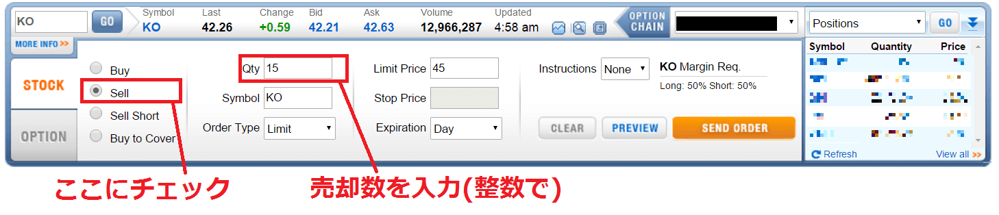 というのはDRIPによる配当再投資等を行っていると、保持銘柄数が28.134と端数が現れることがよくあるからです。 (端数部分のの0.134個の株は「Fractional shares」と呼ばれます) このとき「0.134」とか「12.778」といった数を売却することはできません。 必ず整数で入力してください。