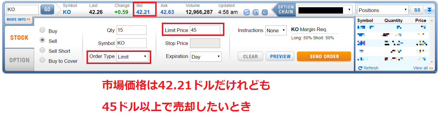 例えばLimitでは下図のように「現在42ドル台のコカ・コーラの株が45ドル以上になったら売却したい」といった願いを叶えてくれます。 Limit Priceに「45」と入力すれば良いのです。