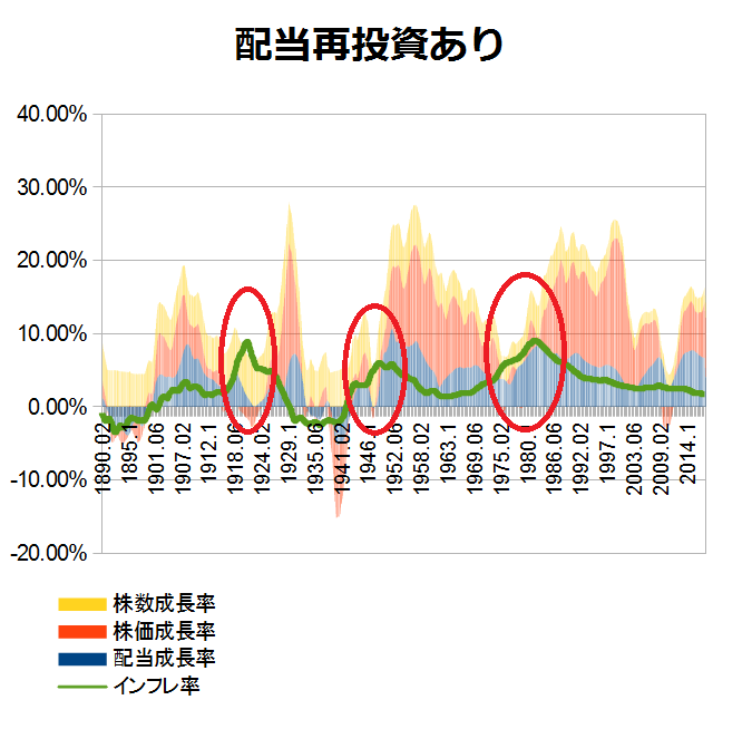 赤丸は高インフレ期間。配当再投資すれば株数成長率が増えてインフレに負けない成長率を得られる。高インフレをすぎるとリターンは一気に増える