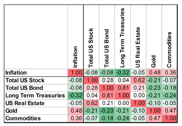 一方で米国株、米国債券、長期米国債、さらに以外にも米国不動産はインフレ率との相関係数がすべてマイナスです。インフレ率が上昇すると価格が下がりやすい傾向にあることを意味します。