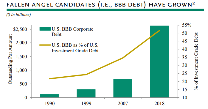現在、米国の発行済み投資適格社債の過半数(54%)がBBB格社債でその額は2.5兆ドルを超えます。エネルギーセクターは14%あるのですから、単純な掛け算でBBB格エネルギーセクター発行済み債券額は3500億ドル程度となります。