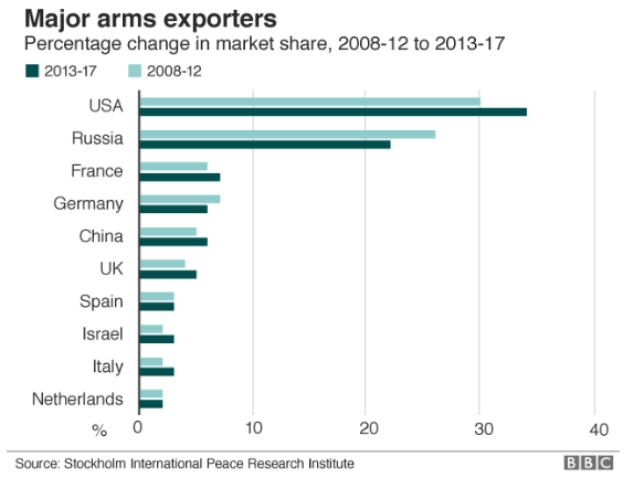 2014-18年にかけての米国武器輸出数の合計は、2008-13年の合計の29%増でした。