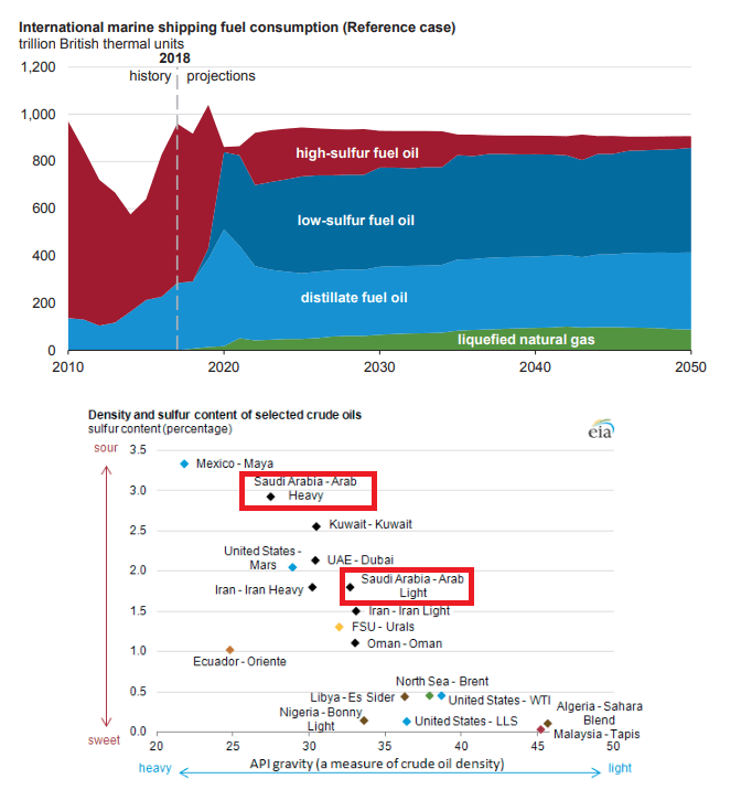 サウジは財政的に非常に苦しいですが、追い打ちをかけるかのように、国際海事機関のルール変更で来年から海上輸送燃料における硫黄を多く含む燃料の需要が大幅に減るとみられています。