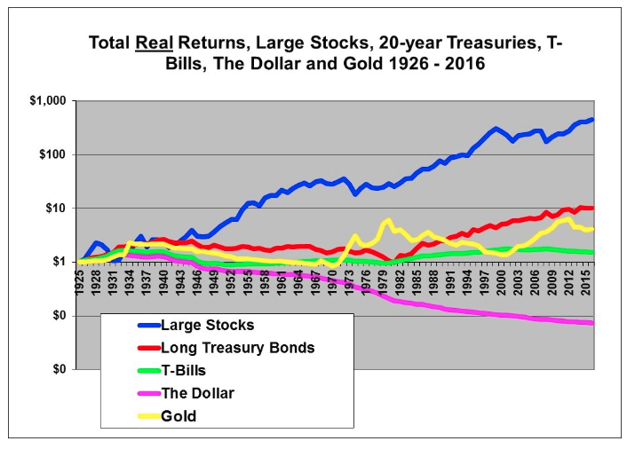 視覚的にわかりやすいようにチャートで見てみると、1970年代の高インフレ時代にはゴールドは何倍もの実質リターンを出しましたが、株式、米国債、財務省短期証券はマイナスでした。