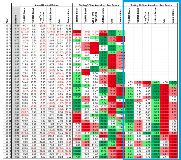 下図は1972-90年の各資産クラスのリターンです。見たいのは水色で囲んだ部分で、左側は米国インフレ率、右側は各資産クラスの3年移動平均実質リターンを表します。