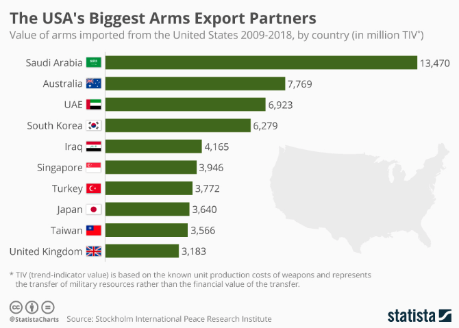 2014-18年の米国武器輸出全体の52%は中東向けで、その多くはサウジアラビアです。現在サウジアラビアは世界最大の武器輸入国ですが、その供給元が米国です。