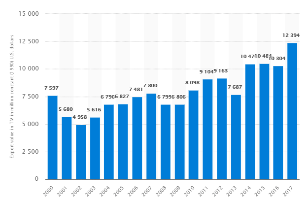 下図はストックホルム国際平和研究所の調査による、米国の2000-2017年の武器輸出数の推移です(金額ではなく武器移転数です)。