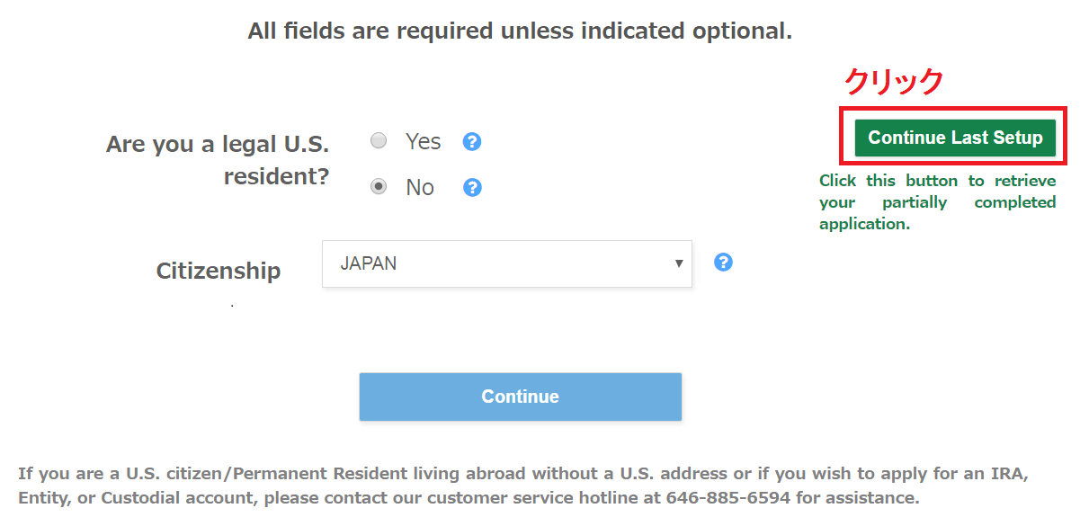 口座開設ページの右側の緑色のボタン「Continue Last Setup」を押して、ユーザーIDとパスワード(ページ2で設定する)を入力すれば前回までの入力内容から再開することができます。