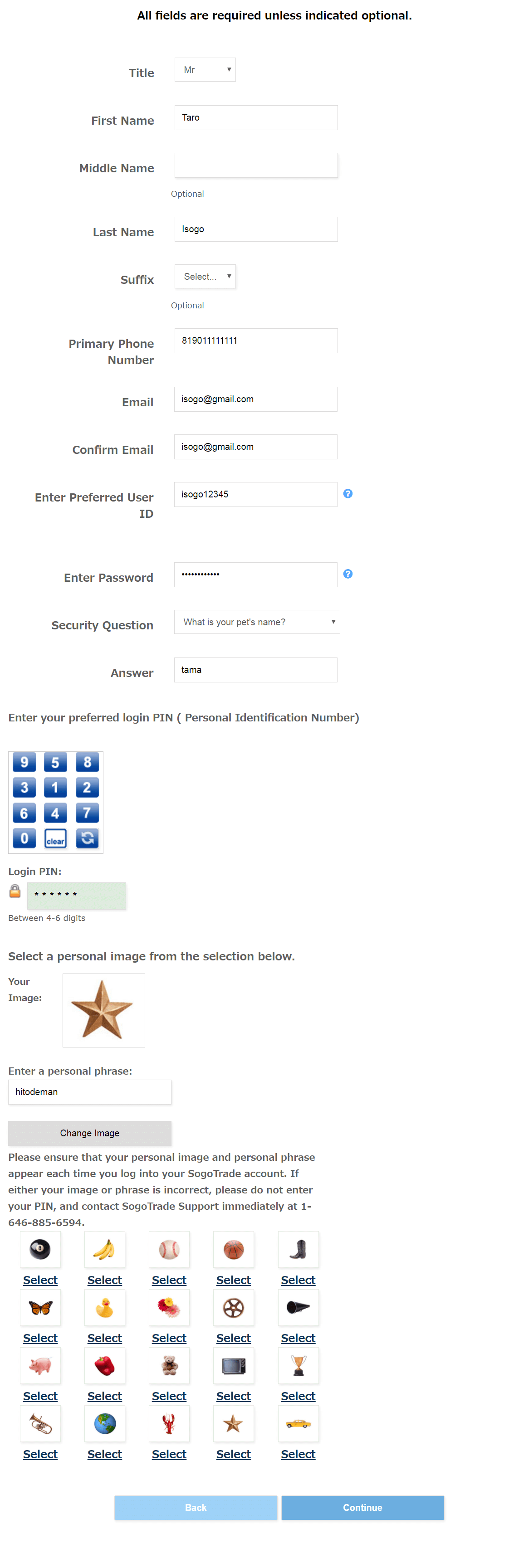 入力が終了したら「Continue」ボタンを押してください。
