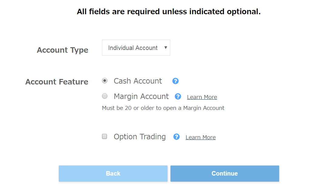 信用取引を希望される方は「Margin Account」を選択してください。こちらを選択される場合は、別の入力項目が現れるので必要事項を別途入力してください。投資経験などについて訊かれます。