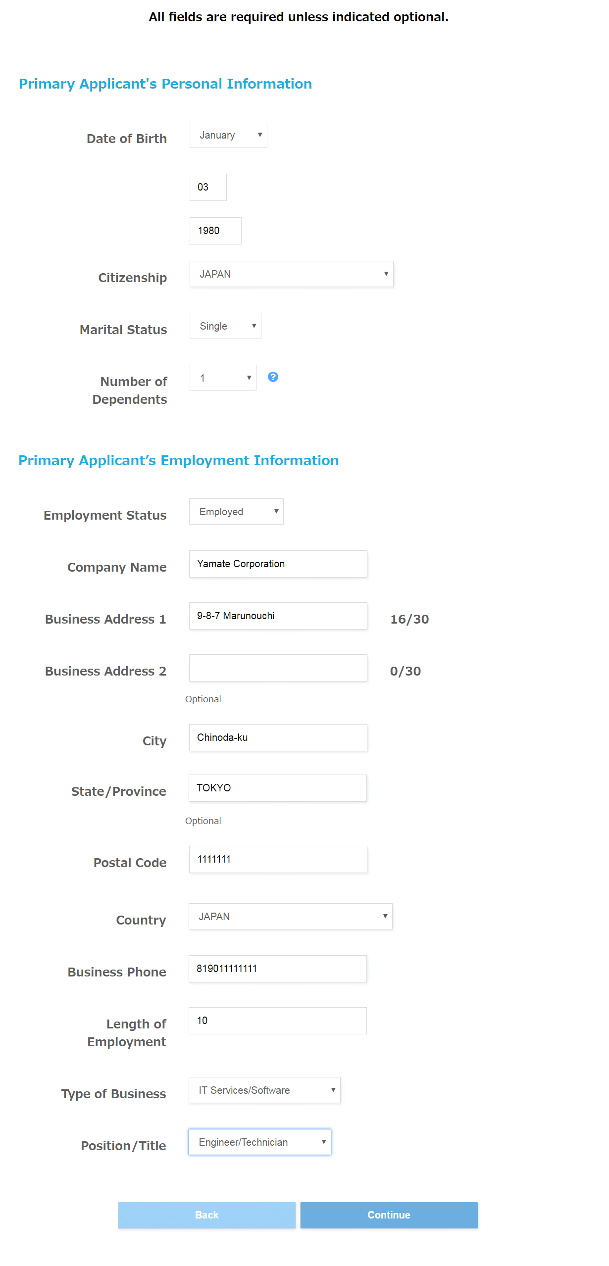続いて個人情報と勤務先情報を入力していきます。まずは下図の例を参考にご自身で入力してみてください。