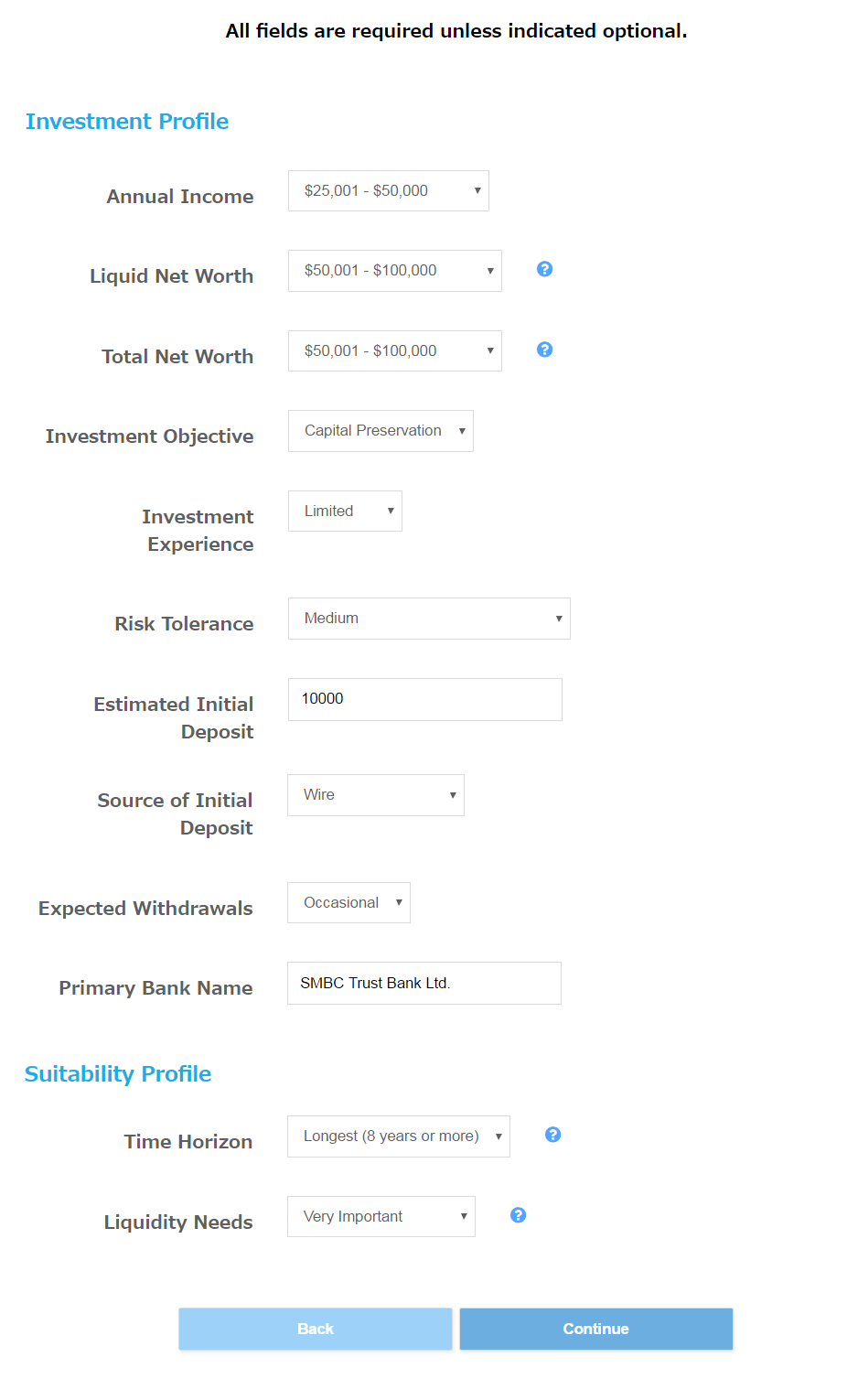 すべての入力が完了したら「Continue」ボタンをクリックしてください。このページで必要事項の入力は終了となります。
